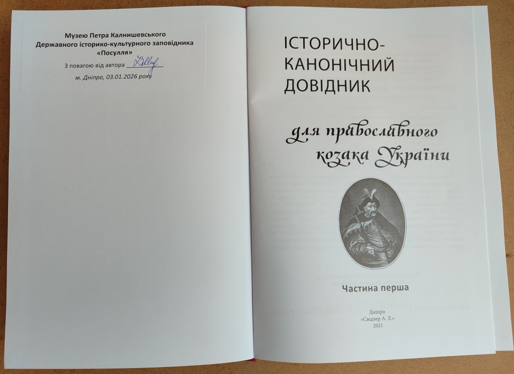 Нещодавно, директором Комунального закладу Сумської обласної ради «Державний історико-культурний заповідник «Посулля» Кривогуз Тетяною Василівною було передано завідувачу Музею Петра Калнишевського (відділ заповідника) Стрипку Ярославу Івановичу наукове видання «Історично-канонічний довідник для православного козака України. Частина перша: Від Трипілля до України», яке подарував музею Мельниченко Володимир Іванович.